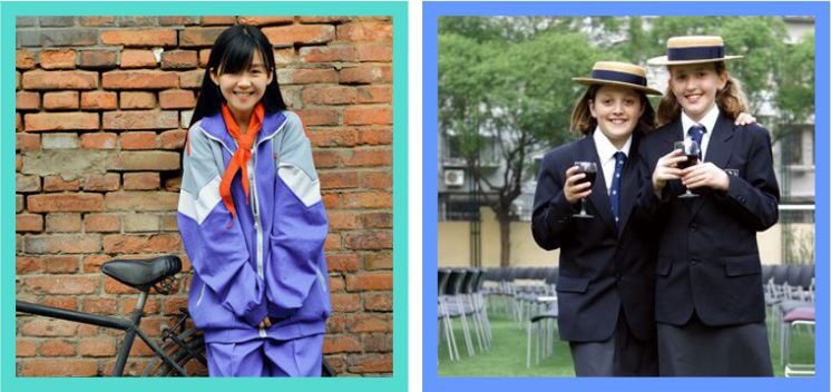 中国学校的校服都是宽大布袋式校服。