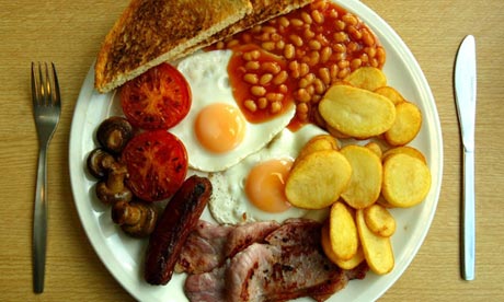 与简单的面包、果酱加咖啡的欧陆早餐不同,英式早餐以丰富著名,标准的英式早餐包括半个烤番茄(half a tomato)、炒蛋(scrambled egg)、香肠(sausage)、咸肉(bacon)、烤黄豆(baked beans)、蘑菇(mushroom)、炸薯块(hash browns)和血肠(black pudding)。