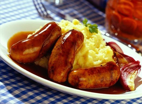 英国酒吧点单率极高的一道菜,几乎每家都有,是香肠和土豆泥(sausage and mash)、香肠主要以湖区特产的坎伯兰香肠(Cumberland sausage)为最佳选择。通常一份是3根香肠铺在大量土豆泥上,或是一长条的绕成圆圈的香肠。因为土豆在英国被看作是主食之一。然后淋上相当于英国“耗油”的洋葱牛肉汁(Gravy)。也有的地方,配合当地的特色,加入了派(Pie)或布丁。