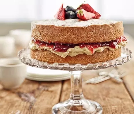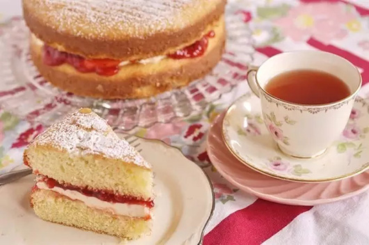 维多利亚海绵蛋糕,是英国下午茶点的经典必备。它因维多利亚女王最喜爱海绵蛋糕的吃法(一层奶油一层果酱)而得名。1861年,维多利亚女王的丈夫阿尔伯特亲王突然逝世,为了让女王走出沉浸在丧夫之痛的隐居生活,亲友们鼓励她继续参加下午茶会。一年后,比顿夫人的《家务管理》中精选了维多利亚三明治菜谱,以纪念女王最爱吃的蛋糕。松软的海绵蛋糕,夹着香甜的奶油乳酪和果酱,至今仍是高档茶馆的不可或缺的茶点。