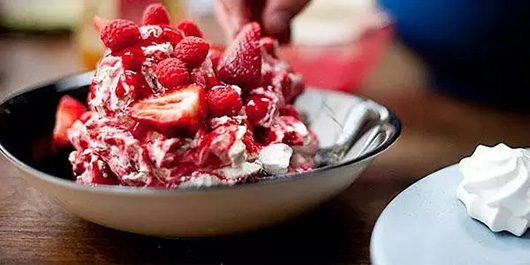 另一个更有趣的版本是1920年,在伊顿公学的校园开放日,一只拉布拉多犬一屁股坐在主人野炊的毯子上,压扁了主人的草莓奶油蛋白饼,创造出了伊顿麦斯。无论如何,如今,甜点伊顿麦斯已成为英格兰夏天的代名词。