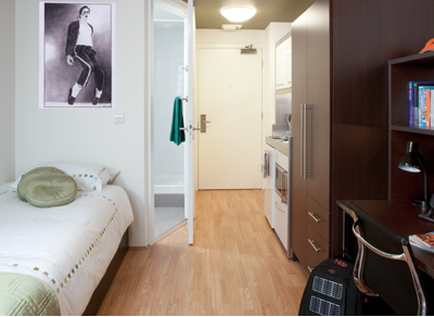 Studio是一种非常常见的房型,大小从12平方米到30平方米不等,房间会提供床、书桌、衣柜、卫生间、浴室、厨房等设施。但是,Studio的厨房都是开放式厨房,所以不太适合做油烟比较大的菜。Studio在所有学生公寓类型中算是比较贵的房型,比较适合经济宽裕喜欢安静的学生居住。